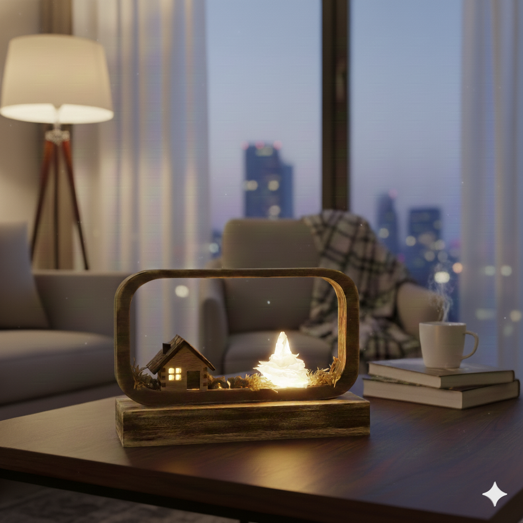 Natur pur für Ihr Zuhause: Diese moderne Dekoration verbindet rustikalen Charme mit klarem Design. Die sanft beleuchtete Holzhütte im eleganten Rahmen schafft sofort eine friedliche Atmosphäre auf jedem Regal. Ein minimalistisches Highlight und die ideale Deko für jeden Anlass, wenn Sie Wert auf Behaglichkeit und zeitlosen Stil legen.
