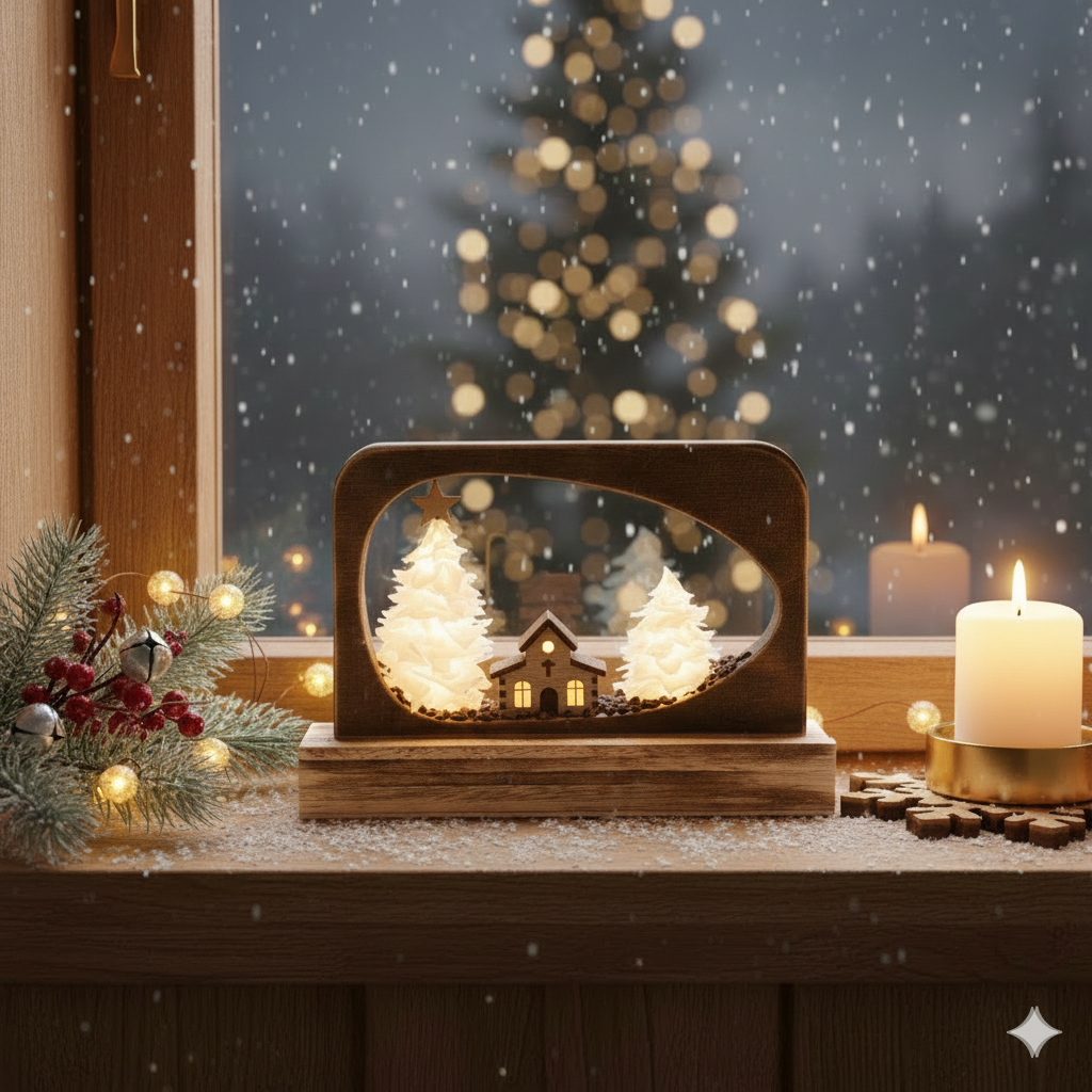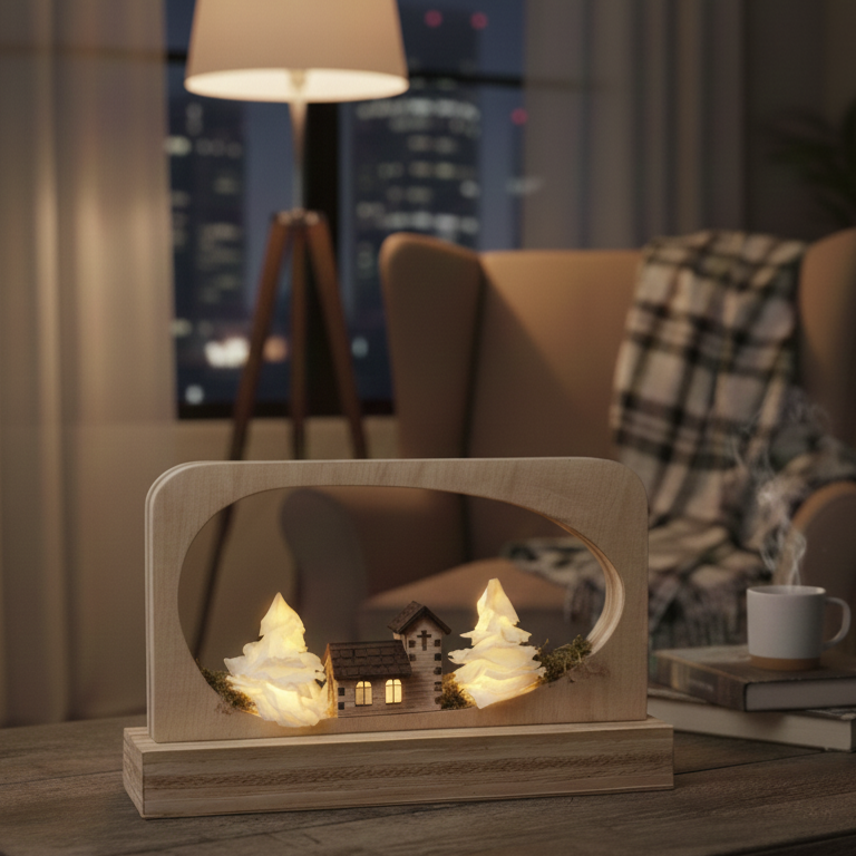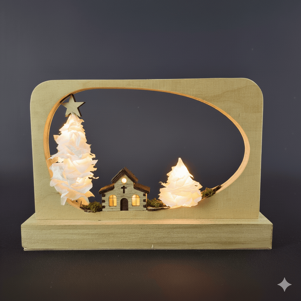 Festliches Design im Oval: Diese moderne Dekoration aus hellem Holz bringt Ruhe in die Weihnachtszeit. Mit der beleuchteten Kapelle und dem strahlenden Stern setzt das Objekt besinnliche Akzente. Ob als eleganter Tischschmuck oder stilvolle Deko für jeden Anlass im Winter – dieses Highlight sorgt für sofortige Wohlfühlatmosphäre und skandinavische Festlichkeit.