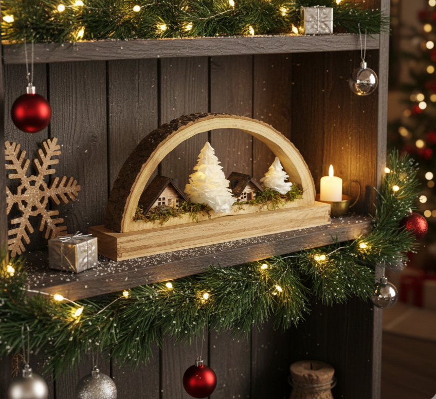 Natürlicher Winterzauber aus Holz: Diese handgefertigte Dekoration bringt die Magie der Berge direkt zu Ihnen. In einem Rahmen aus echter Baumscheibe leuchten rustikale Hütten zwischen schneeweißen Tannen. Dank kabellosem Batteriebetrieb ist dieses Lichtobjekt die ideale Deko für jeden Anlass – ob als gemütlicher Blickfang auf der Fensterbank oder als modernes Highlight auf Ihrer Festtafel.